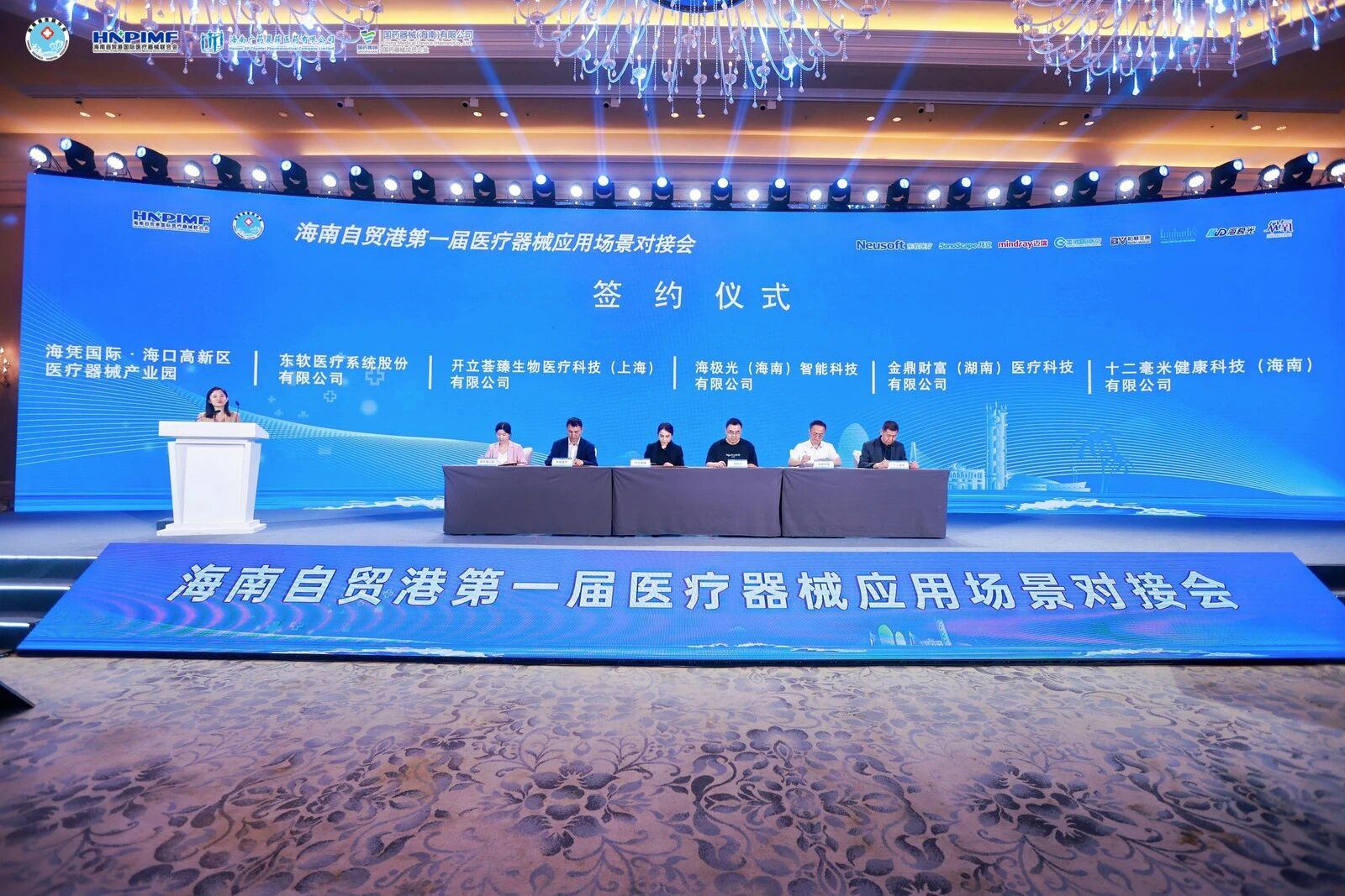 會議的重要環節——“海南自貿港醫療器械中試基地”合作簽約儀式順利舉行。該基地由海南海憑國際醫療器械產業園有限公司發起,聯合東軟醫療系統股份有限公司、開立薈臻生物醫療科技(上海)有限公司、海極光(海南)智能科技有限公司、金鼎財富(湖南)醫療科技有限公司、十二毫米健康科技(海南)有限公司共同創建,旨在為醫療器械從研發到臨床轉化提供全鏈條服務,助力企業降低創新成本、加速產品落地。